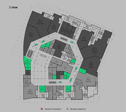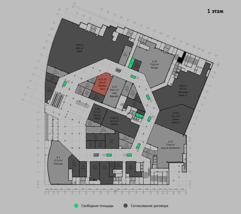 В торговом центре расположатся более 300 брендовых магазинов: Rendez-Vous, Love Republic, Levi’s, Estelle Adony, Incanto, Guess Jeans, Befree, Zarina, Chester, Colin’s, Бизнесмен и многие другие. Из кафе, ресторанов и фуд-корта представлены бренды: Максимилиан, LA Terrace, El Tempo, Безе, KFC, Burger King, Carl's Jr, Ташир Пицца.